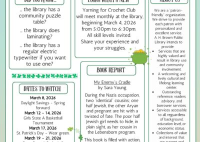 Flyers, Newsletters, and Calendars Book Club Bags 100-Book-Challenge-as-page-1-400×284 Brain Benders after school activities Movie Poster March 2026 Favicon cropped-Favicon.png facebook-300×300-1 ExteriorHero Books-white Ed Packet Library 100 Book Challenge as page 2 Libby Help Flier Community Room (1) Legos March 2026 News Letter Front Book Sale The Lemonade War (2) Community Puzzle (2) Make & Take March 2026 Tea Time (1) March 2026 News Letter Back